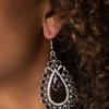 A purple teardrop gem swings from the top of a frilly silver frame radiating with glassy white and glittery purple rhinestone encrusted petals for a regal look. Earring attaches to a standard fishhook fitting.