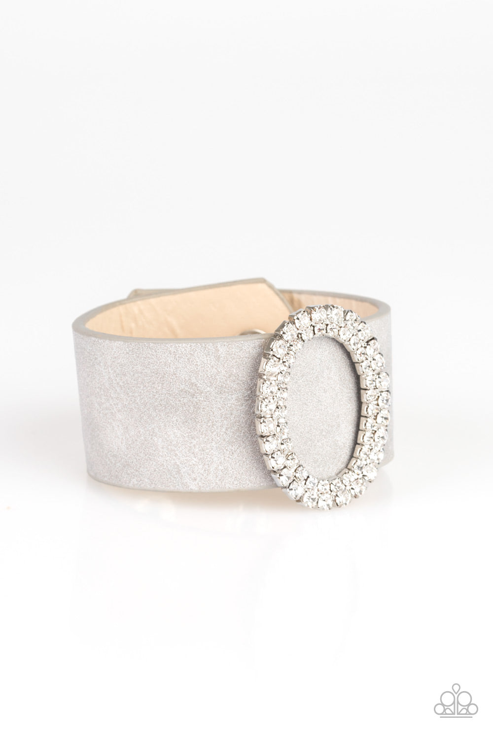 Encrusted in glassy white rhinestones, a round silver frame slides along a thick gray leather band for a glamorous look. Features an adjustable snap closure.