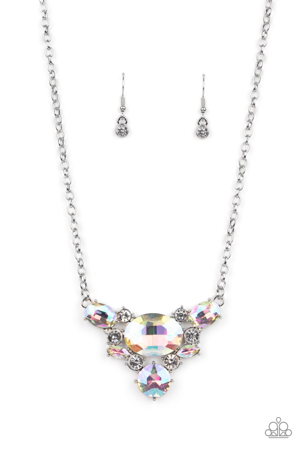 Featuring a UV shimmer, oversized iridescent gems and glassy white rhinestones delicately coalesce into a v-shaped pendant below the collar for an over-the-top glamour. Features an adjustable clasp closure.