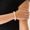 White pearls and a white rhinestone encrusted silver charm are threaded along a stretchy band, creating a glamorous centerpiece atop the wrist.