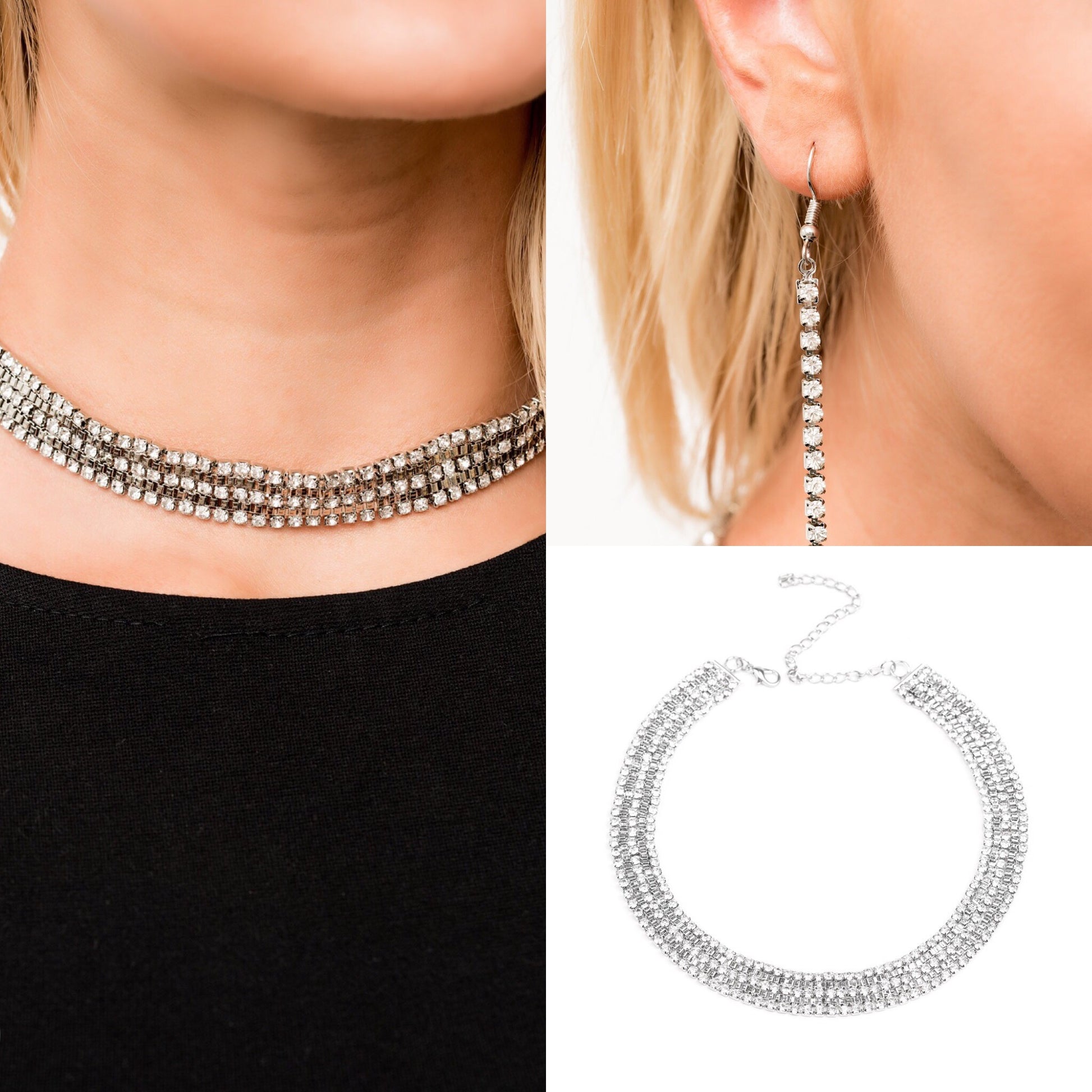 Featuring sleek square fittings, strands of glittery white rhinestones connect with rows of silver box chains around the neck of glittery twist