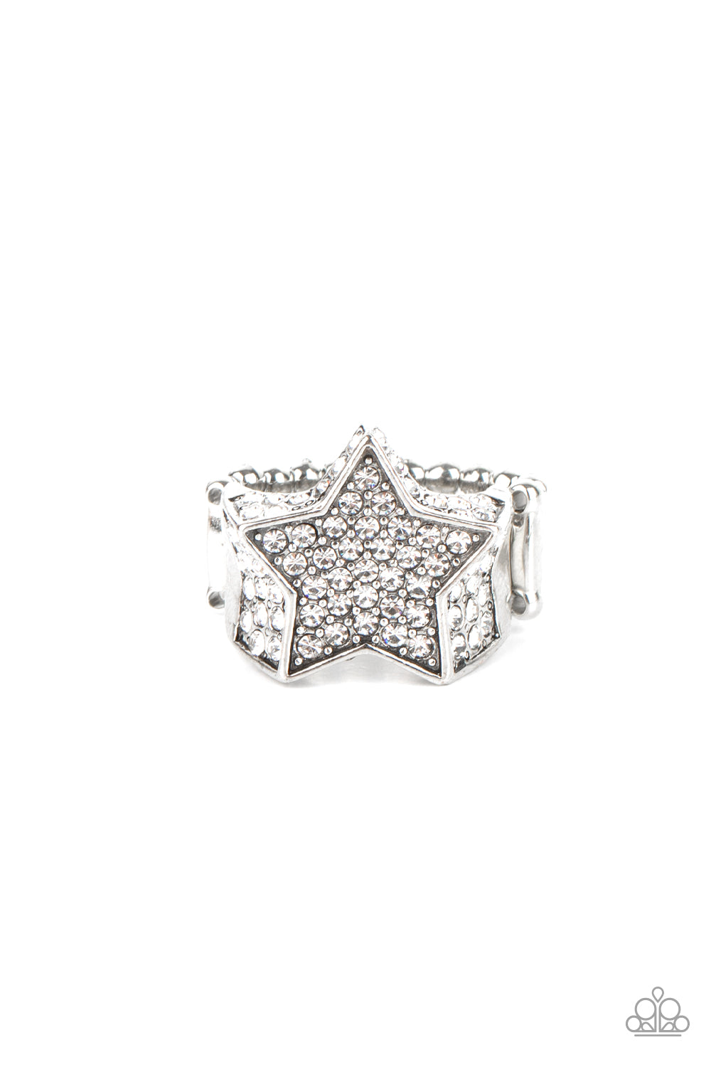 Encrusted in glittery white rhinestones, a sparkly silver star joins with a thick band of blinding white rhinestones. The edges of the star are embellished in additional white rhinestones, creating a stellar centerpiece atop the finger. Features a stretchy band for a flexible fit.