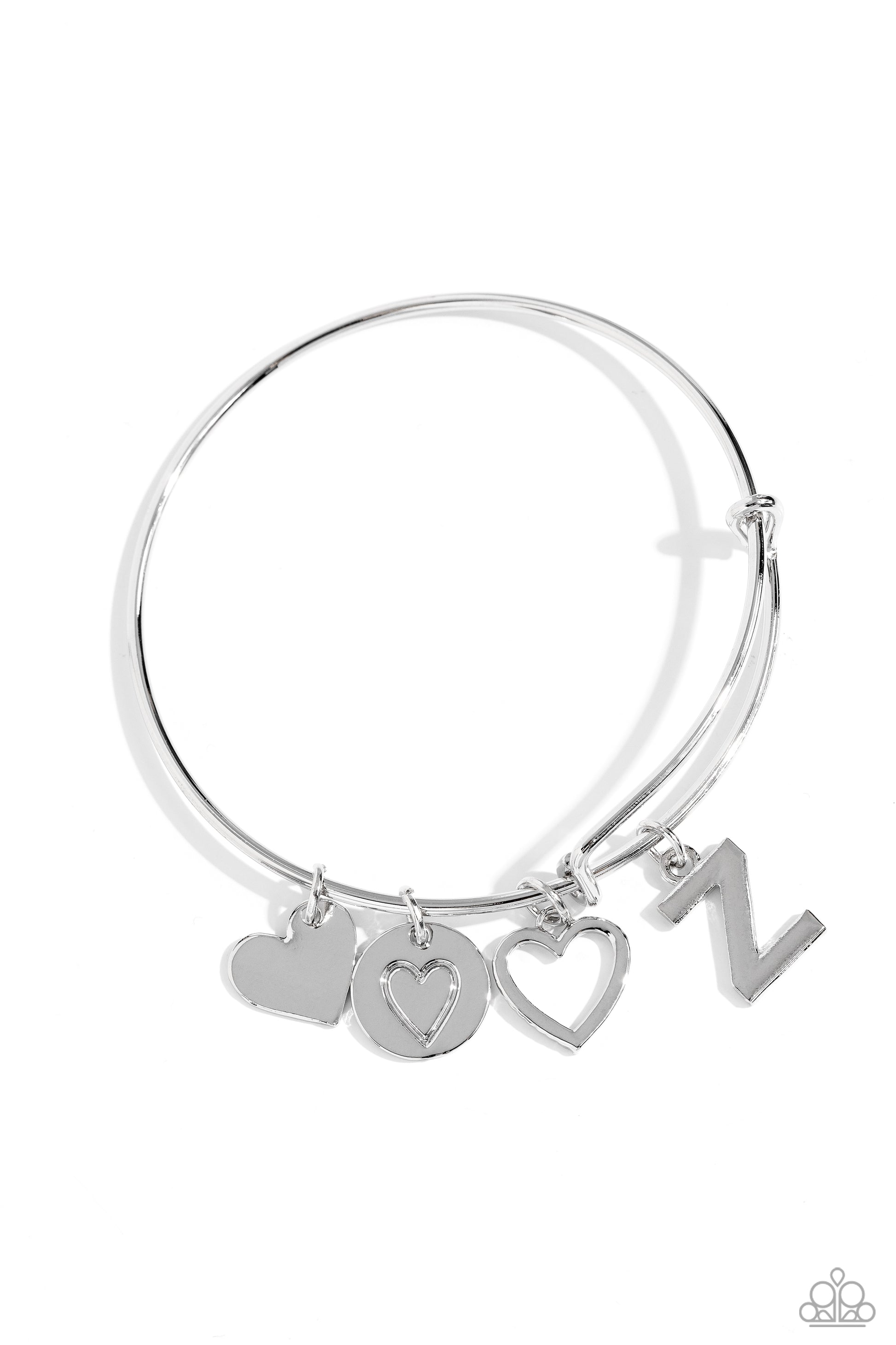 Featuring shiny silver, airy, and stamped finishes, a mismatched collection of dainty heart charms, and the letter "Z" glides along a silver bar fitting at the center of the wrist for a romantic, sentimental flair.