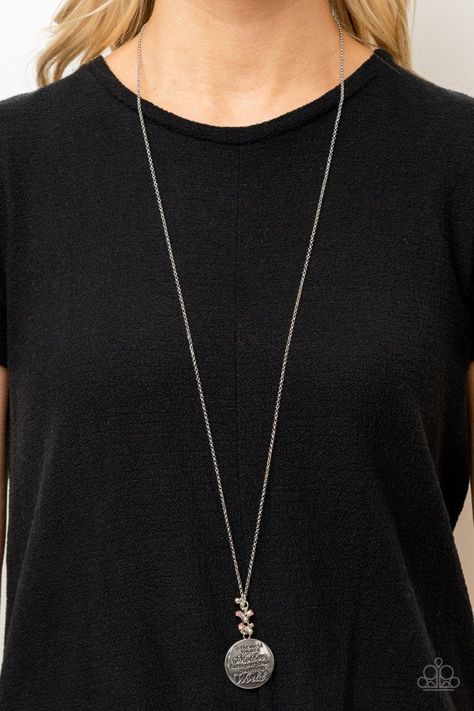 A silver disc inscribed with the phrase, "To the world you are a Mother, but to your family you are the World," creates a sweet reminder as it falls from a lengthened silver chain. A sprinkle of dainty light rose rhinestones and silver beads adds a decorative fringe atop the memento. Features an adjustable clasp closure.