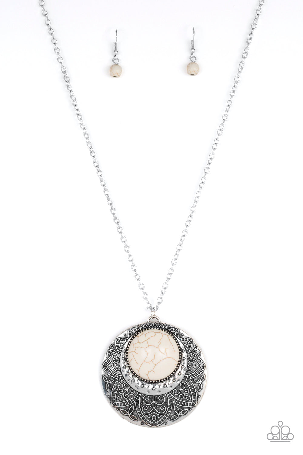 Swinging from the bottom of a lengthened silver chain, a refreshing white stone is pressed into a hammered silver medallion radiating with floral details for a bold tribal inspired look. Features an adjustable clasp closure.