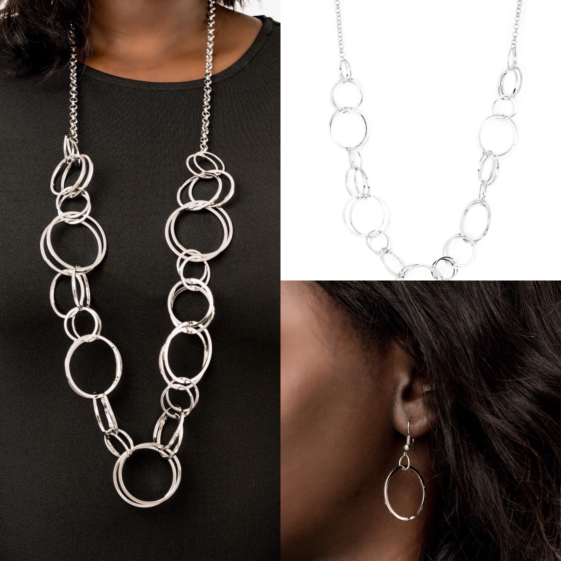 Pairs of dramatically oversized silver hoops connect across the chest creating an elegantly elongated statement piece that is as fearless as it is versatile.
