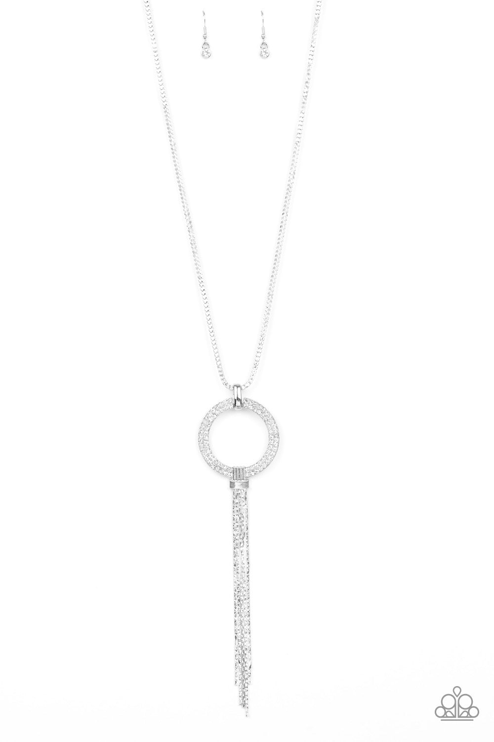 Encrusted in blinding white rhinestones, a sparkling silver ring swings from the bottom of a lengthened silver box chain. Flattened silver chains stream from the bottom of the glittery pendant for a regal finish. Features an adjustable clasp closure.