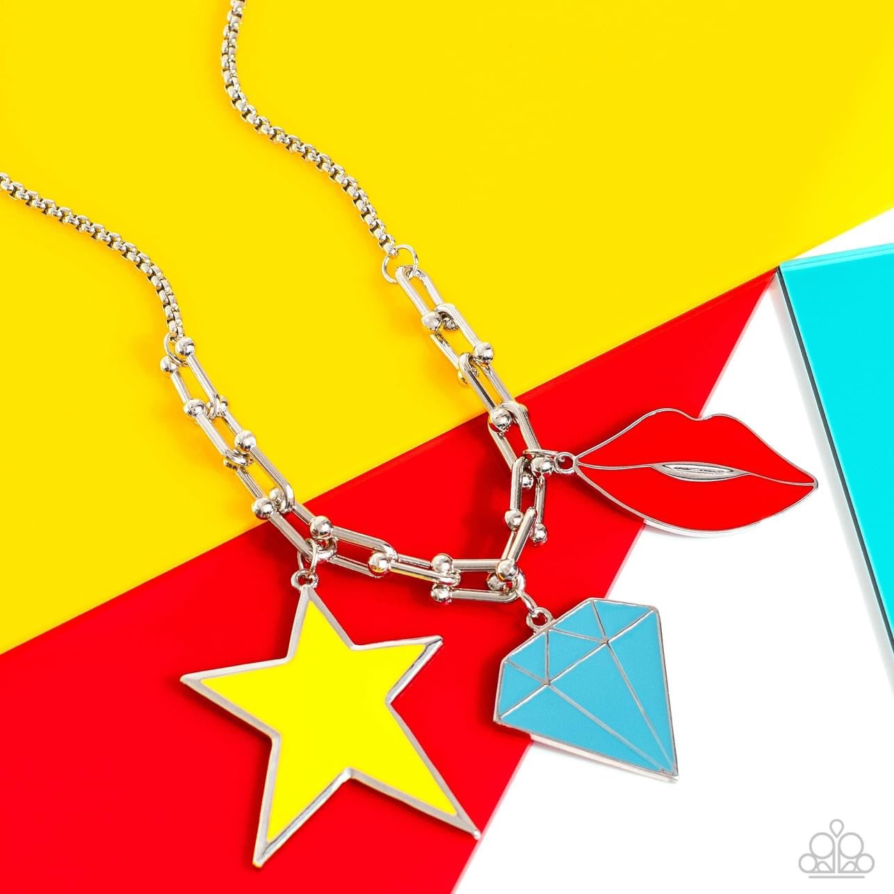 A strand of gleaming silver popcorn chain leads the eye down to a collection of silver horseshoe-like strands that coalesce below the collar. Attached to the horseshoe fittings, an oversized yellow star, turquoise diamond, and red lip charm add a youthful pop of color to the design for a trendy finish. Features an adjustable clasp closure.