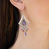 Featuring a vivacious purple bead, a studded silver teardrop swings from the top of a kite-shaped silver frame. Dainty purple and wooden accents swing from the bottom of a hammered frame, creating a seasonal fringe. Earring attaches to a standard fishhook fitting.