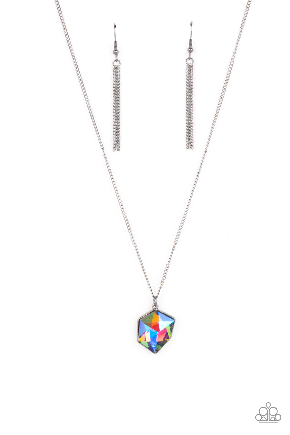 Featuring an oil spill shimmer, an iridescent raw-cut gem dazzles below the collar, creating out-of-this-world sparkle. Features an adjustable clasp closure.